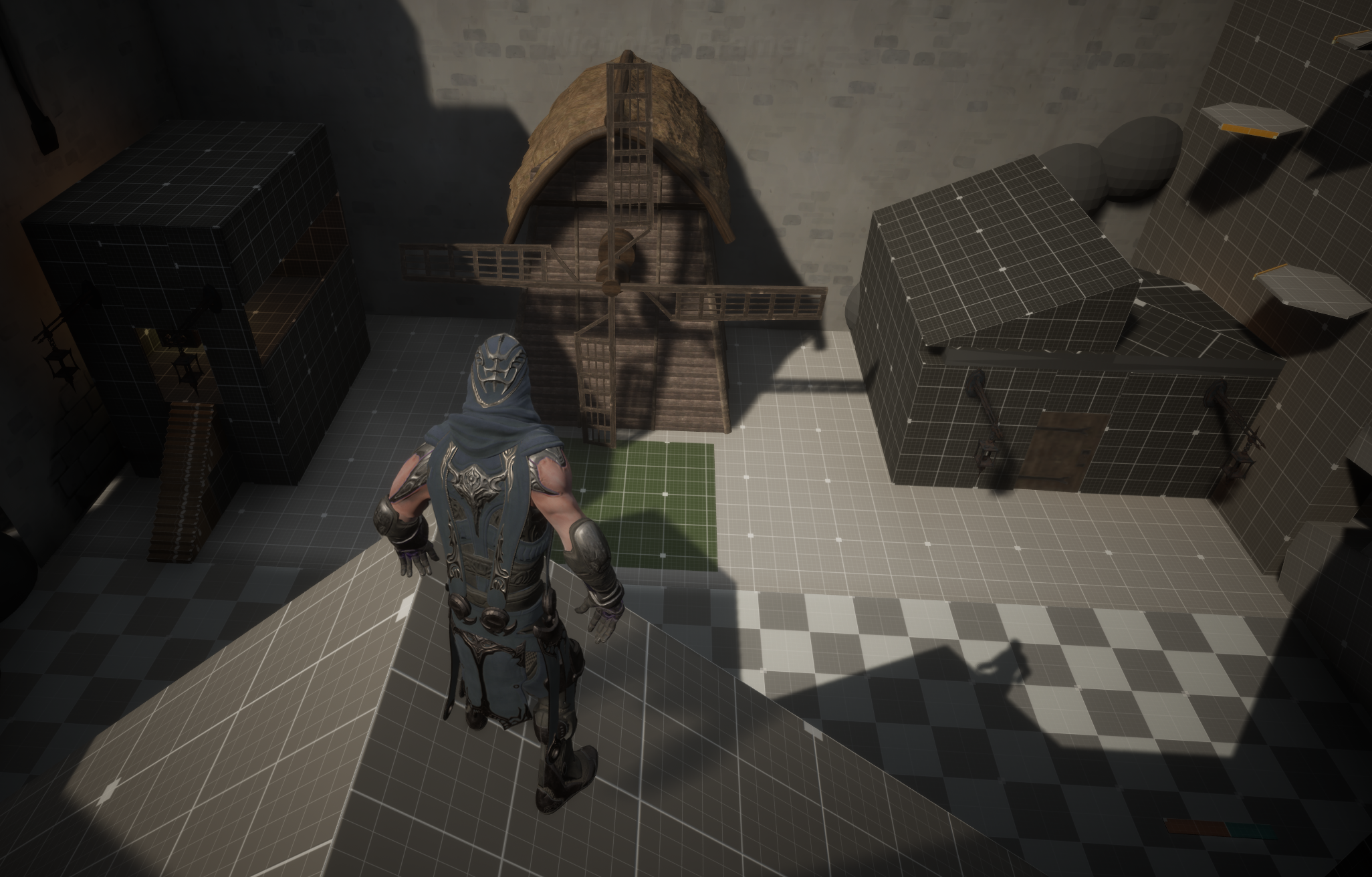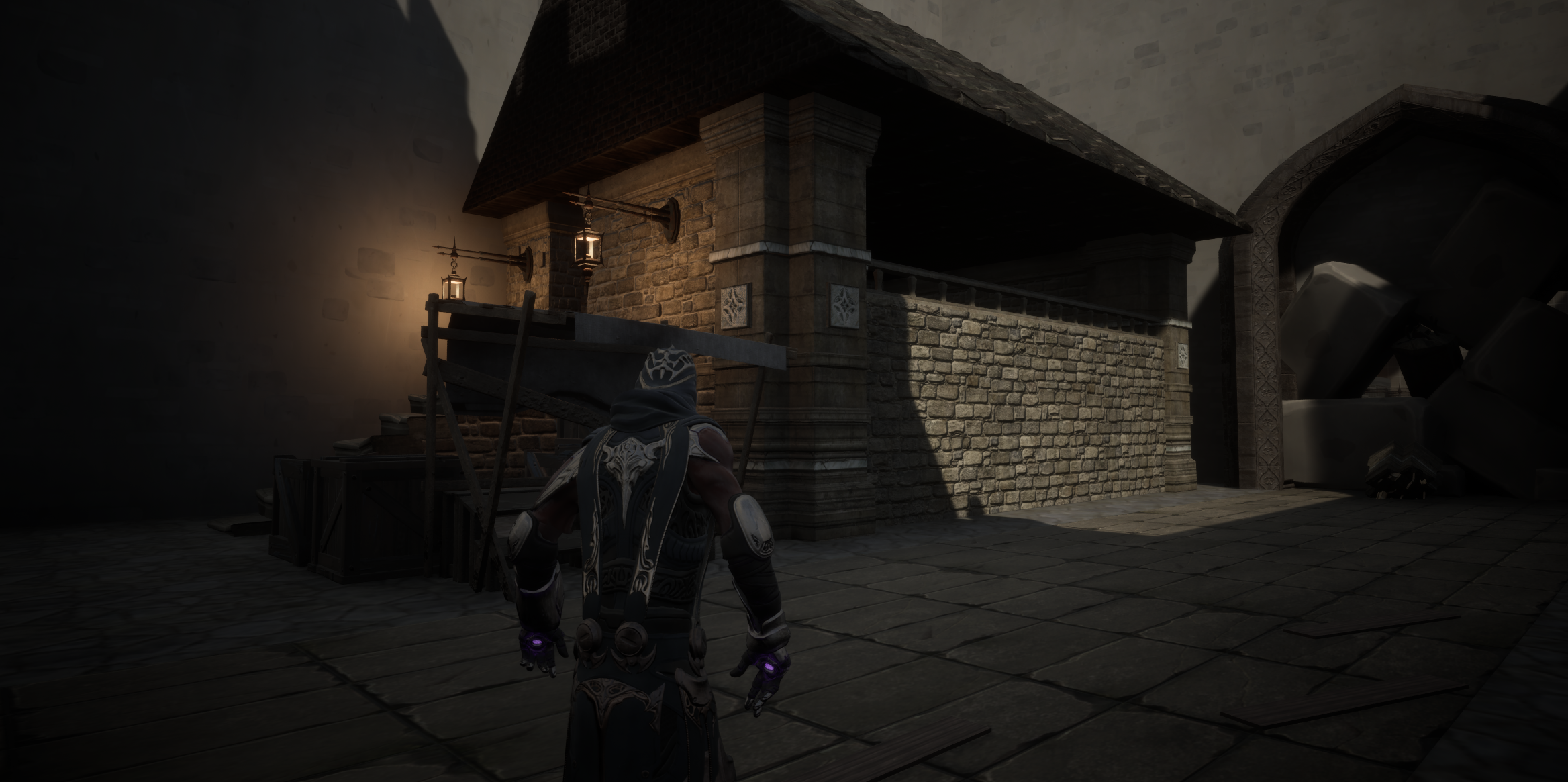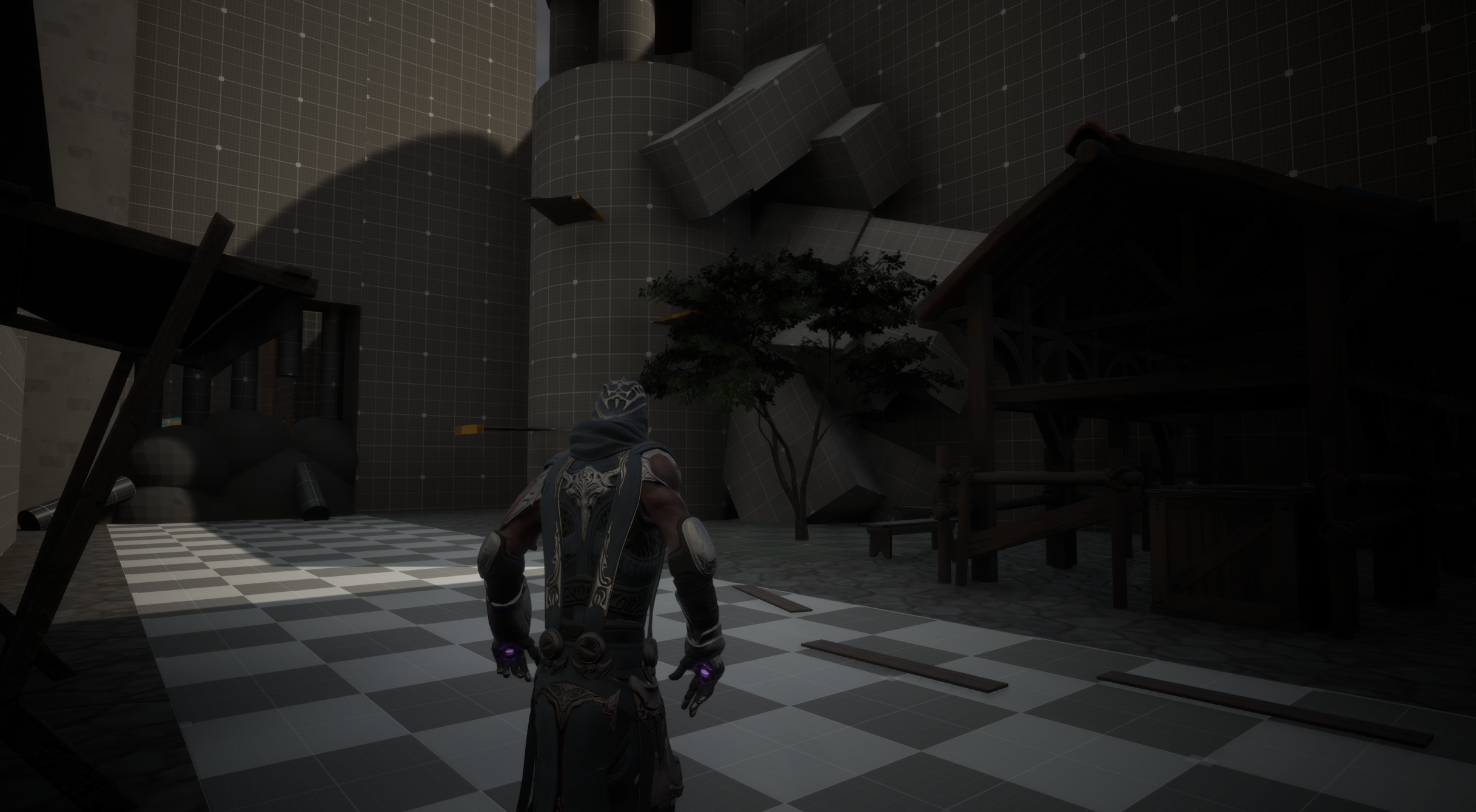 The Beta phase of this project was my favorite as implementing the assets gave me ideas on how I wanted them in my level and ended up changing smaller portions of my level to flow better and play better. When my plain grid walls turned into a fortress and my blocks representing buildings turned into actual buildings, I became more immersed in the project and that allowed for a lot of fine details I couldn't see before. The segment of my level start that transitions into the focal point is the area I am the most proud of. The tower looks like it had survived a major siege, the little park has a healthy section of grass to indicate that a long amount of time has passed since that siege, and the outpost with the merchant table looks well done.